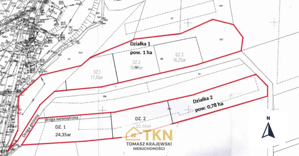 Działka nr 2 – 0,78 ha,ma wydane warunki zabudowy na budowę dwóch budynków mieszkalnych jednorodzinnych